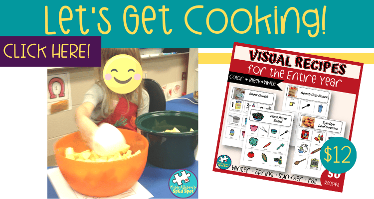 Hi Reader! Do you cook in your classroom? I do!😋 Cooking time each week is one of my students' absolute favorite 🥰activities! I loved the real-world functional application of math skills and manners. And the kids loved the yummy treats! 🍪 To learn more about what cooking looks like in my classroom, check out my blog post: Cooking in the Special Education Classroom Unsure where to start? I have a classroom cookbook with Visual Recipes for the Entire Year that is full of seasonal cooking...