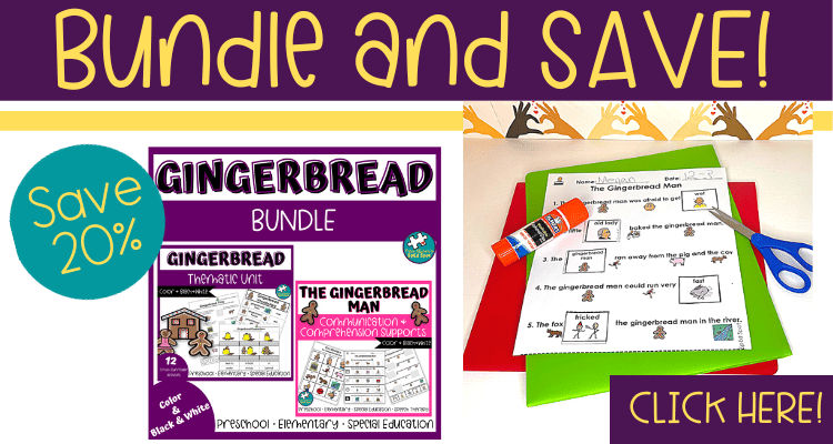 Do you have a diverse group of students this year? Don't worry! I have that covered too. Every activity in each of my thematic units includes ideas for accommodating and extending to meet your students' needs. â Ready to hit autopilot on those lesson plans? My Picture Book Communication and Comprehension Supports for The Gingerbread Man retold by Mary Sandels are the perfect book companion to make it easier to differentiate popular picture books to meet the diverse needs of your students! â Can't choose what to try first? No worries! Grab them both and save 20% with my bundle! â Until next time! â |